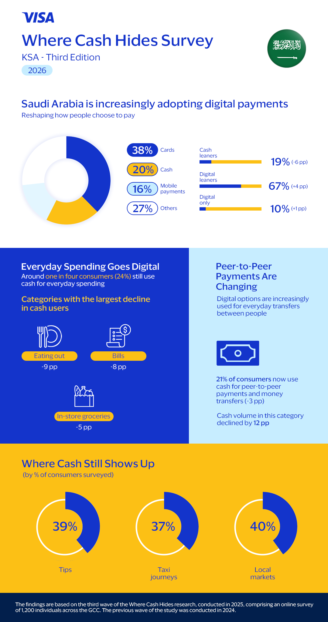 Riyadh, Saudi Arabia — January 21, 2026: Digital payments are continuing to reshape how people choose to pay in Saudi Arabia, with more consumers embracing faster, more secure digital experiences. Visa’s third edition ‘Where Cash Hides’ report¹ shows 67% of KSA consumers are largely non-cash users, making most of their payments with payments cards or mobile devices. This is an increase of 4% compared with last year, highlighting a clear move away from cash.